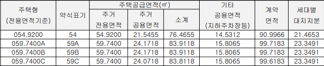 ▶ 59.1473 주택형은 세대별공급면적이 78.7964이며 24.18평에 해당합니다. 그리고 기타공용면적을 포함한 계약면적은 127.9256㎡로 38.76평에 해당합니다. 즉 전용면적 59㎡ 아파트를 짓기 위해서는 약 39평에서 40평의 건물을 지어야한다는 이야기입니다.